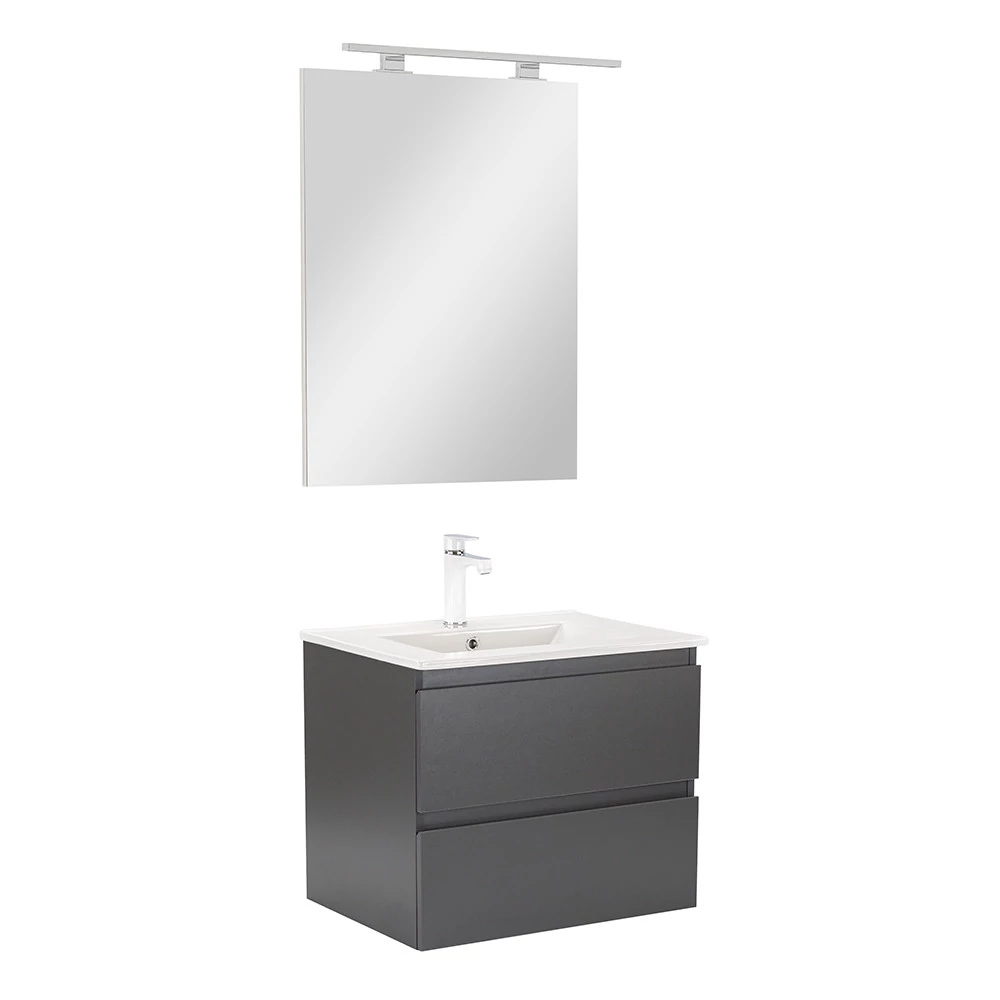 A Vario Forte 60 komplett fürdőszobabútor egy stílusos és praktikus választás modern fürdőszobához. Kompakt méretei ideálisak kisebb és közepes méretű fürdőszobákba is, a 45 fokos élzáródás modern hatást, a antracit-antracit színű dizájn elegáns megjelenést kölcsönöz a térnek. A csillapítós fiókzáródás és a felfüggesztett kivitel a kényelmet és könnyű tisztántartást szolgálja, míg a minőségi anyagok hosszú élettartamot biztosítanak.