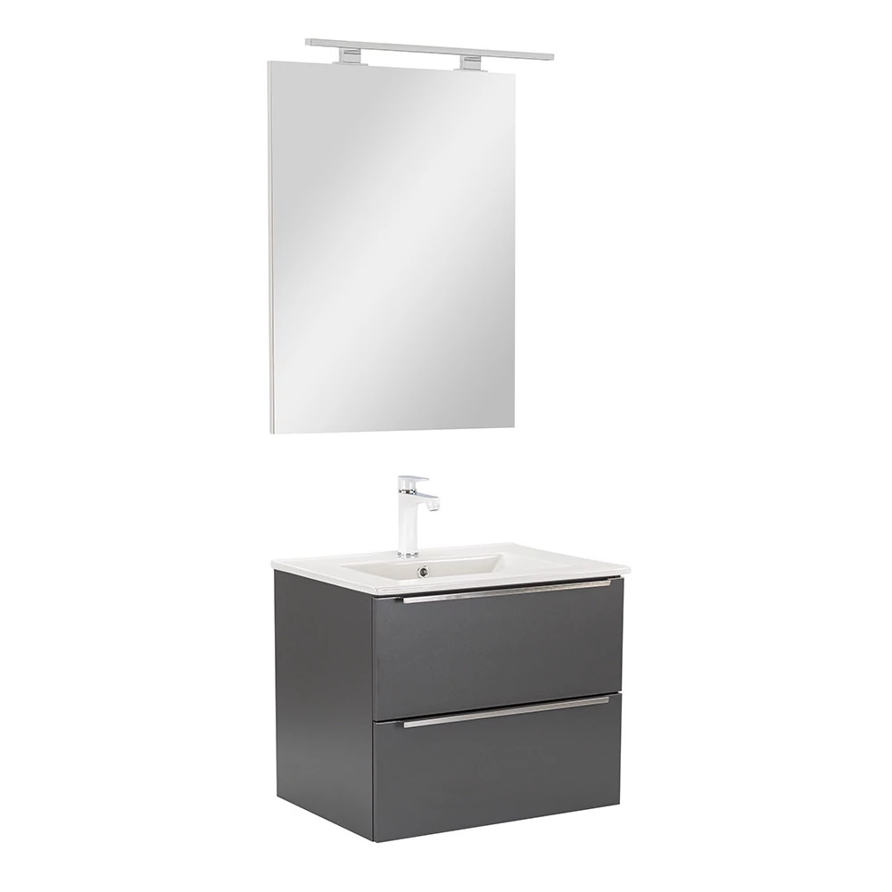 A Vario Trim 60 komplett fürdőszobabútor egy stílusos és praktikus választás modern fürdőszobához. Kompakt méretei ideálisak kisebb és közepes méretű fürdőszobákba is, és a fém fogantyú profil patinás hatást, a antracit-antracit színű dizájn elegáns megjelenést kölcsönöz a térnek. A csillapítós fiókzáródás és a felfüggesztett kivitel a kényelmet és könnyű tisztántartást szolgálja, míg a minőségi anyagok hosszú élettartamot biztosítanak.