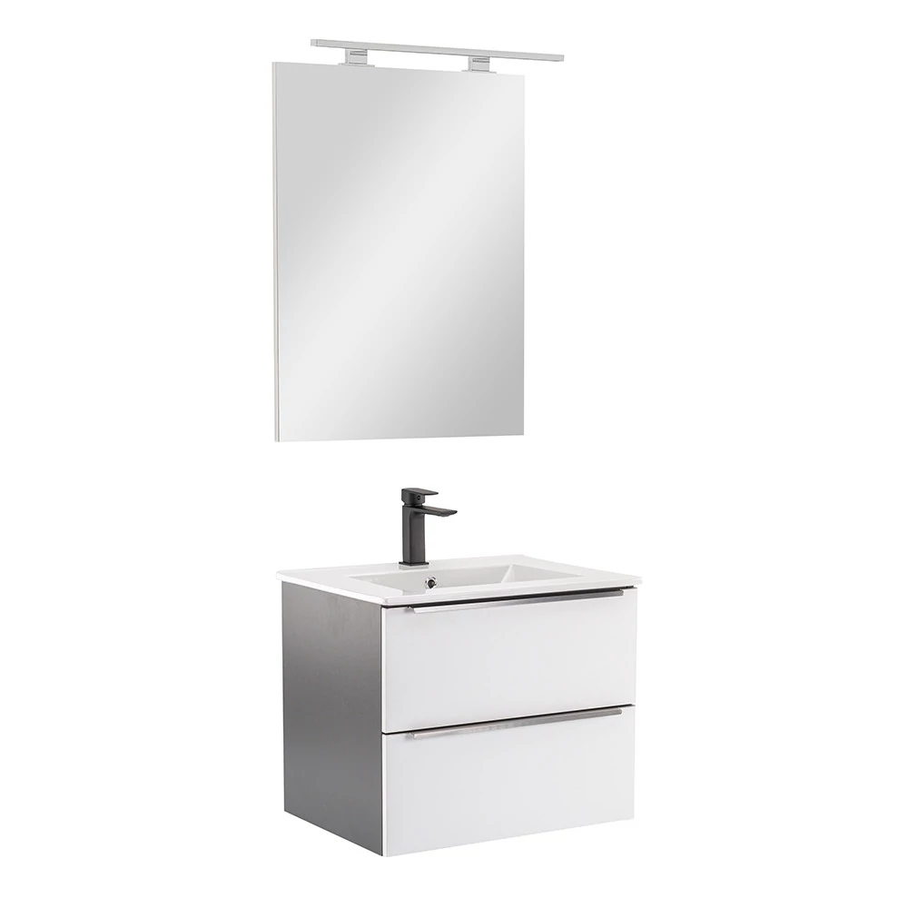 A Vario Trim 60 komplett fürdőszobabútor egy stílusos és praktikus választás modern fürdőszobához. Kompakt méretei ideálisak kisebb és közepes méretű fürdőszobákba is, és a fém fogantyú profil patinás hatást, a antracit-fehér színű dizájn elegáns megjelenést kölcsönöz a térnek. A csillapítós fiókzáródás és a felfüggesztett kivitel a kényelmet és könnyű tisztántartást szolgálja, míg a minőségi anyagok hosszú élettartamot biztosítanak.