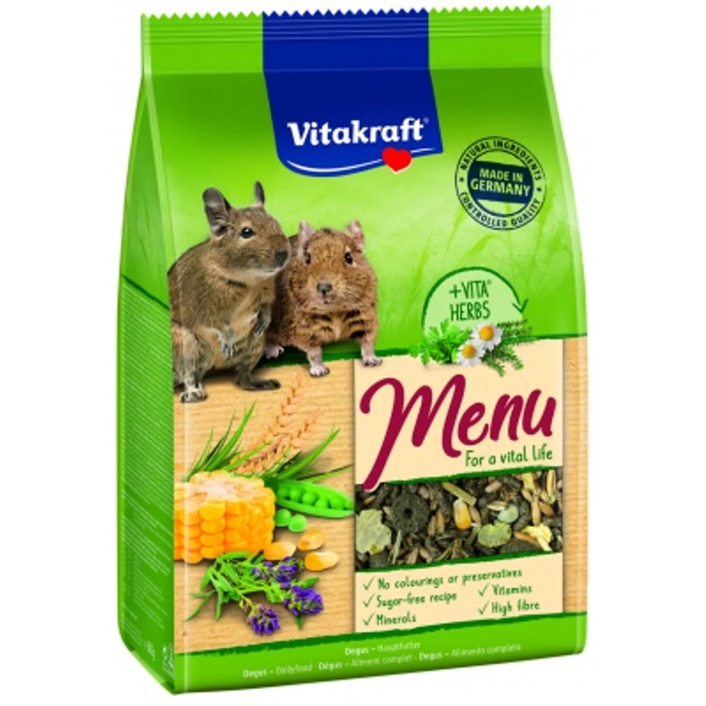 Természetes alapanyagokból készült tápláló, ropogós keverék egészséges gabonafélékből, zöldségekből és mogyoróbélből. Ízletes teljes értékű eledel deguknak.