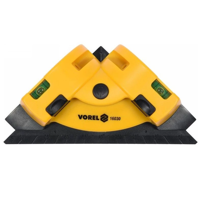 Lehetővé teszi az egyenes vonalak és 90°-os szögek pontos meghatározását. Jól látható vörös vonalakat hoz létre körülbelül 10 m-es hatótávolsággal. Az alapban található tapadókorongoknak köszönhetően stabil rögzítést biztosít vízszintes és függőleges síkok (pl. padló vagy fal) sima aljzatához. A helyes beállítást két hagyományos libella biztosítja. A készülék teste sérülésgátló mechanikus ABS-ből készült. Tápellátás - Három 1,5 V-os AA elem Cél/Alkalmazás: Függőleges vagy vízszintes vonalak és 90°-os szög pontos beállításához.