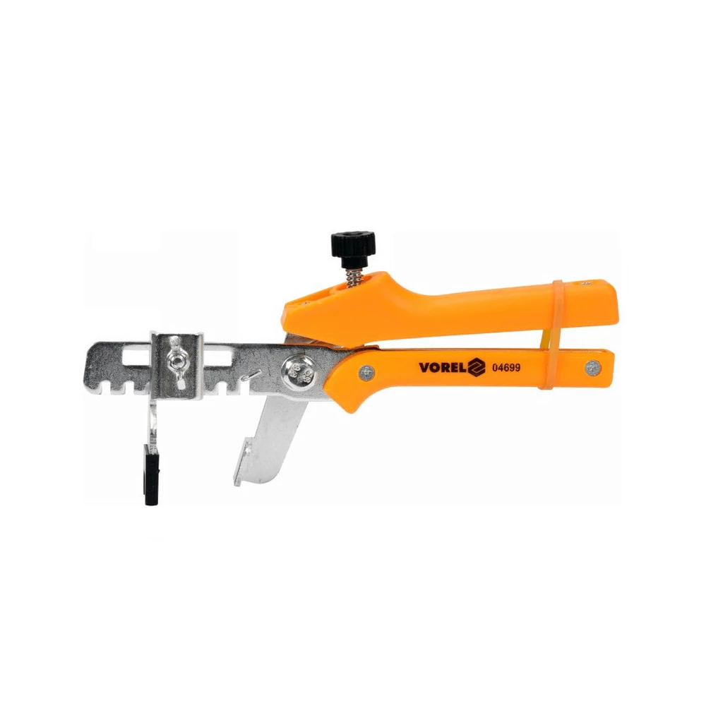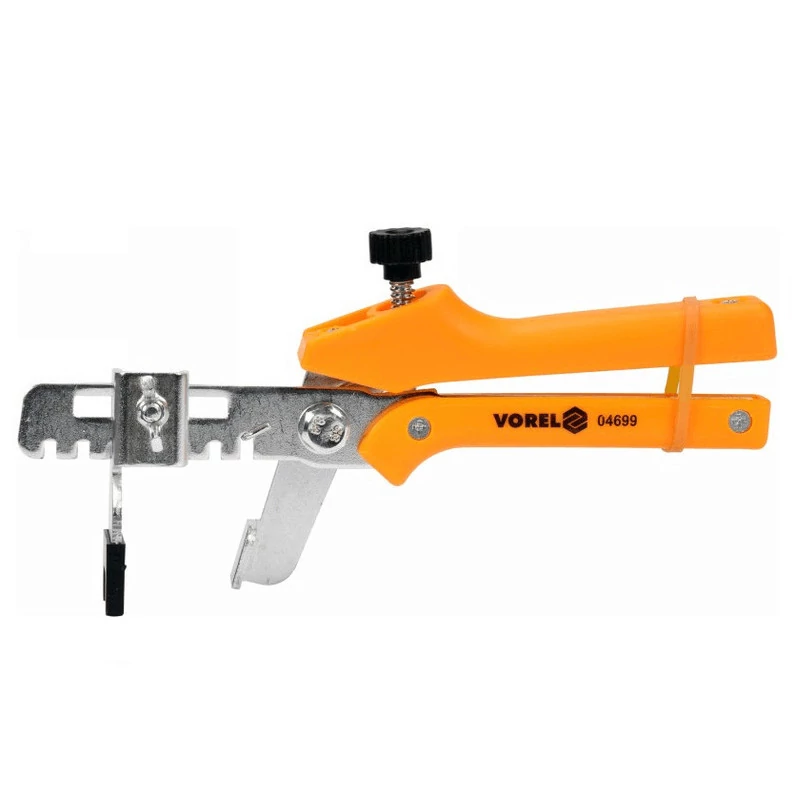 Burkolatszintezõ fogó a hatékony, gyors és precíz szintezéshez csempék lerakásakor. Alkalmas amatõrök és profik általi használatra. Különféle szintezõrendszerekhez használható. Jellemzõk: • Anyaga: horganyzott fémlemez további, tartós mûanyagból készült védõelemekkel • Hosszúság: 230 mm • Mûködési tartomány: 20-70 mm Használata: • Helyezze az elsõ fogót az ékre és a hátsó pofát a végfalra. • Állítsa be a megfelelõ pofatávolságot, és a fogantyú megnyomásával nyomja be az éket a bilincsbe. • A fogó benyomja az ékeket az elembe, így négy szomszédos csempének a sarka irányítottan megemelkedik.