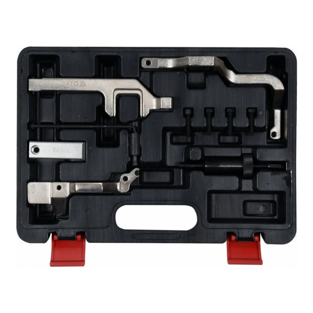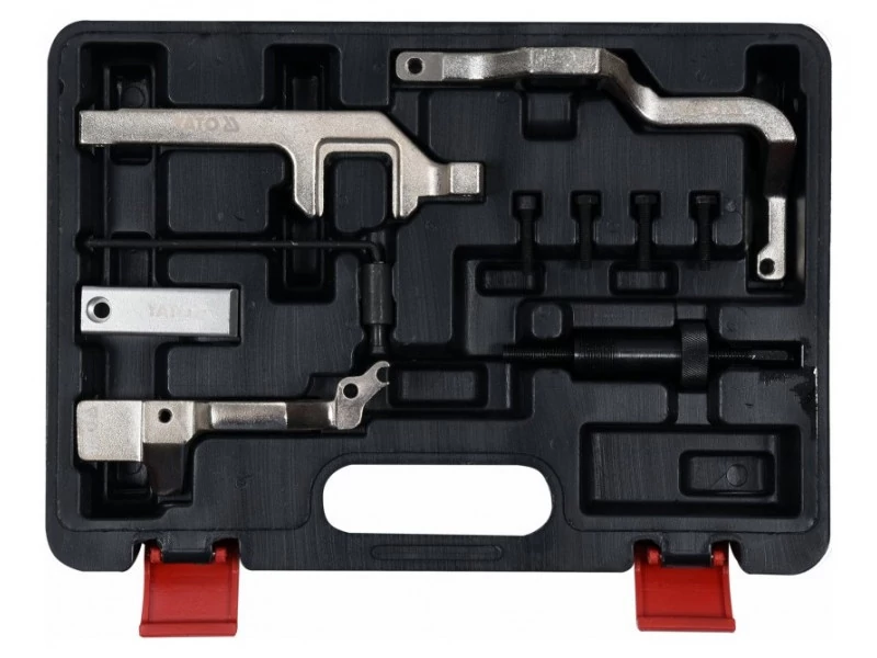 A YATO YT-06001 professzionális vezérlésrögzítő készlet ideális választás a PSA és BMW csoporthoz tartozó benzinmotorok időzítésének beállításához. Tartalmazza a GMP beállító sablont, a vezérműtengely sablont, a feszítőgörgő tűt, valamint a rögzítőcsavart, mindezt praktikus hordozótokban.