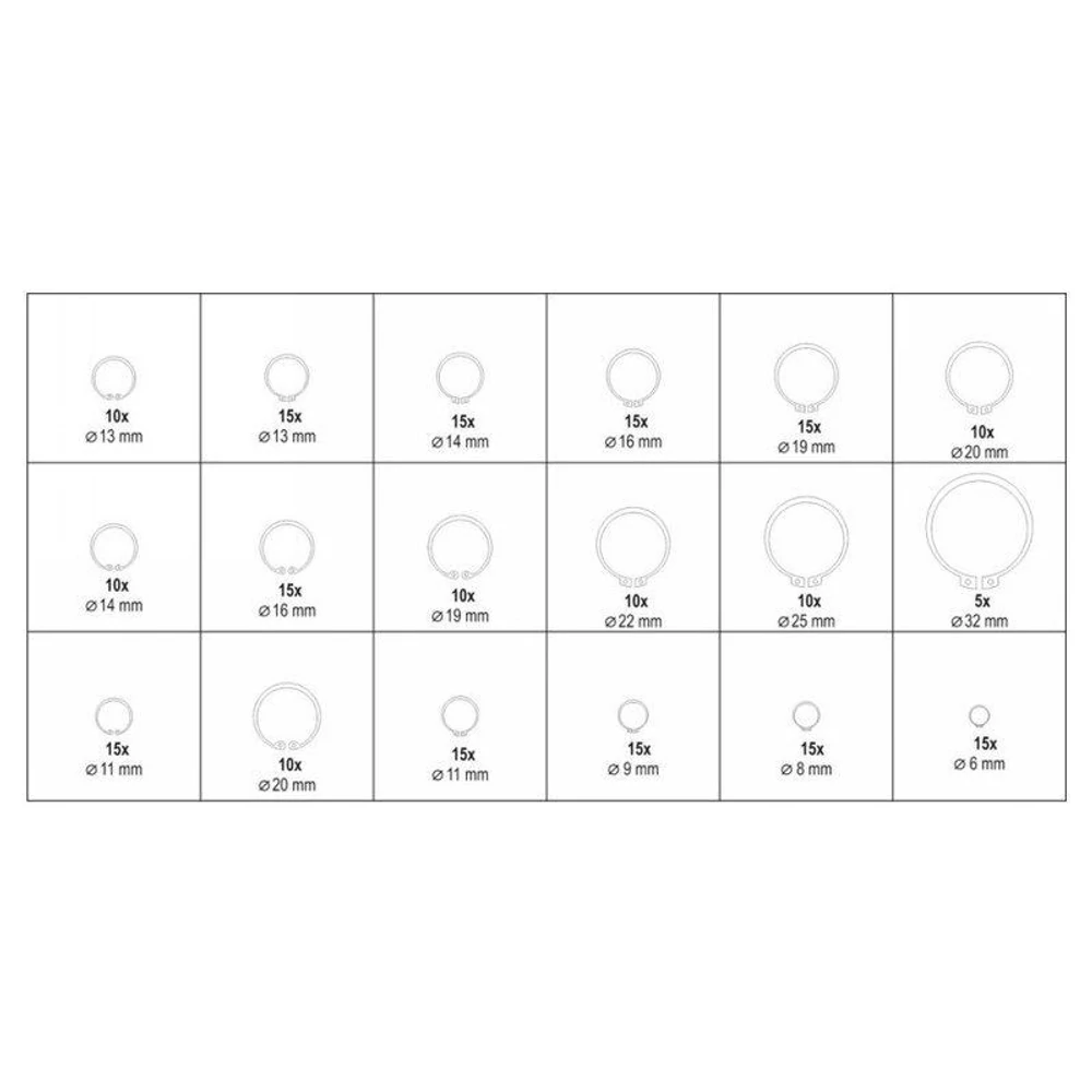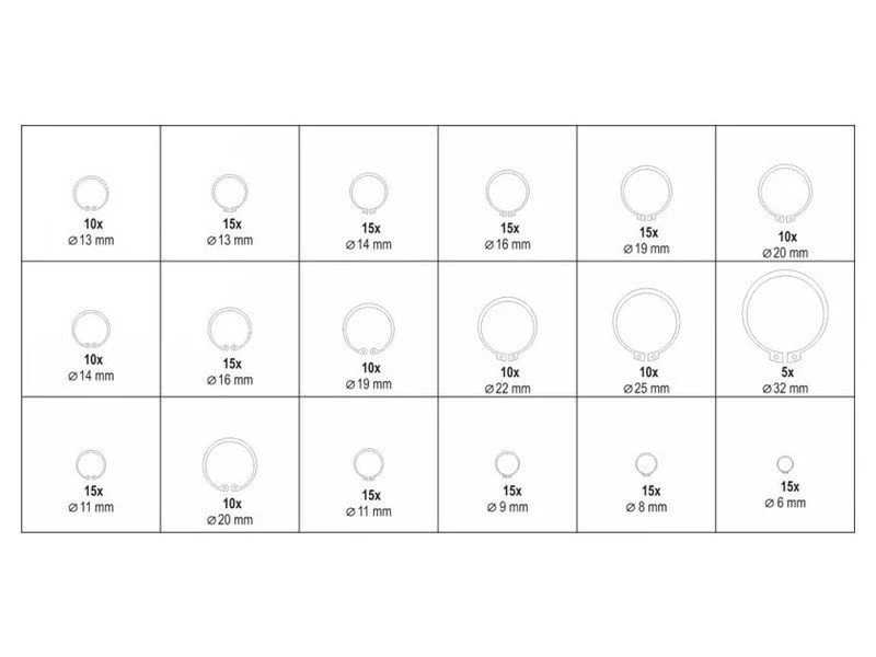 300 darabos zégergyűrű készlet a javítóműhelyek számára Praktikus tárolódobozban szállítjukTartalmaz:- külső: 6, 8, 9, 11, 13, 14, 16, 19, 20, 22, 25, 32mm- belső: 11, 13, 14, 16, 19, 20mm