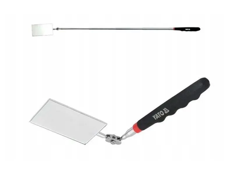 A YATO ellenőrző tükör nagy segítség karbantartó központok, autószerelők, hegesztők számáraLehetővé teszi az autó, gép, berendezés, stb.megközelíthetetlen, rejtett elemeinek megtekintését, vagy varrat ellenőrzést a fal és a cső köztA tükör egy 0,6 mm vastagságú tükörpolírozott acéllemezből készült, teleszkópos rúdra szerelt, csuklós rögzítésselA szerszámot korrózióálló bevonattal látták el, puha anyagból készült ergonomikus fogantyúval rendelkezikA teleszkópos kar hossza akár 750mm, a tükör mérete 50x90mm