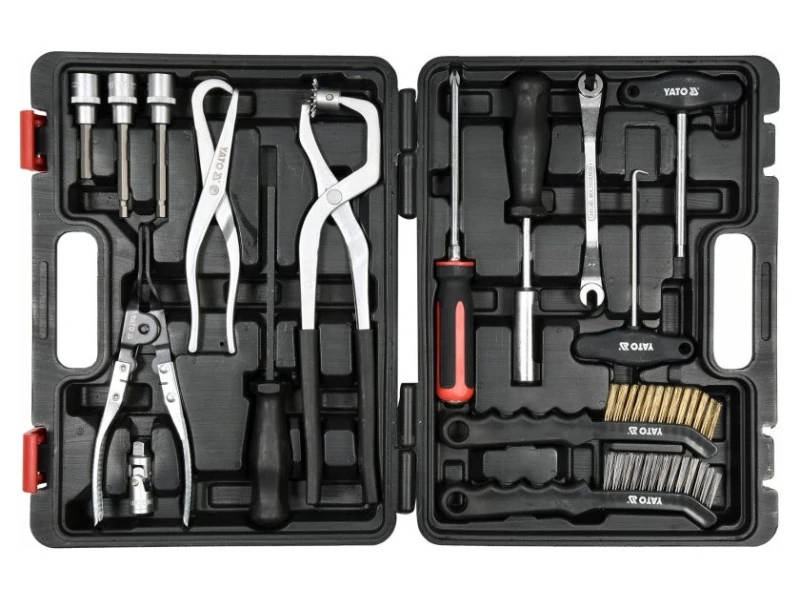 YATO Fékrendszer szerelő készlet 15 részes 1/2" 3/8" CrV Fékrendszerek szervizkészleteA készlet lehetővé teszi a fékrendszerek teljes körű szervizelését és regenerálását. 15 magas minőségű anyagból készült elemet tartalmaz, beleértve a tartós CrV acélt.univerzális méretekstrapabíró tokban csomagolva a szerszámok kényelmes szállítása érdekében Használati figyelmeztetések: Figyelem! Mindig használjon személyes védőfelszerelést a munka során.