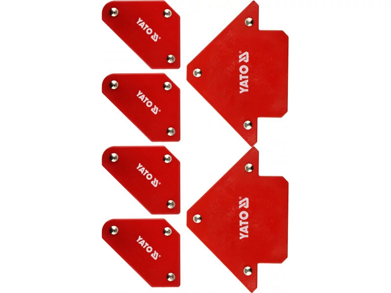 YATO Hegesztési munkadarabtartó mágnes készlet 6 részes 6-os mágneses hegesztési szögkészlet YT-08678, acéllemezből és erős ferritmágnesekből készült. Porbevonatos felület. Fémalkatrészek ideiglenes összekapcsolására szolgál hegesztés, fúrás, festés során.4 darab mini szögkészlet:tartóerő: 4,5 kgalkalmazás szögekben: 45°, 90° és 135° méretek: 43 x 72 x 12 mmÉs 2 darab nagy szög:tartóerő: 11,5 kgalkalmazás szögekben: 45°, 90° és 135° méretek: 82 x 118 x 14 mm