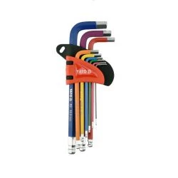 Színes L-alakú imbuszkulcs készlet gömb végekkel. A készlet praktikus és kényelmes mûanyag tartóba van csomagolva, a kulcs színjelölése pedig megkönnyíti a megfelelõ méret megtalálását. Jellemzõk: • Anyaga: S2 acél 58-62 HRC keménységgel • Csavarozás akár 25°-os szögben • Méretek (SW): 1,5 mm - szürke (14,5 x 78,5 mm) 2 mm - rózsaszín (16 x 83 mm) 2,5 mm - zöld (17,5 x 90,5 mm) 3 mm - türkiz (21 x 99 mm) 4 mm - sárga (23 x 110 mm) 5 mm - narancssárga (27 x 122 mm) 6 mm - piros (30 x 138 mm) 8 mm - lila (33 x 152 mm) 10 mm - kék (38 x 166 mm)