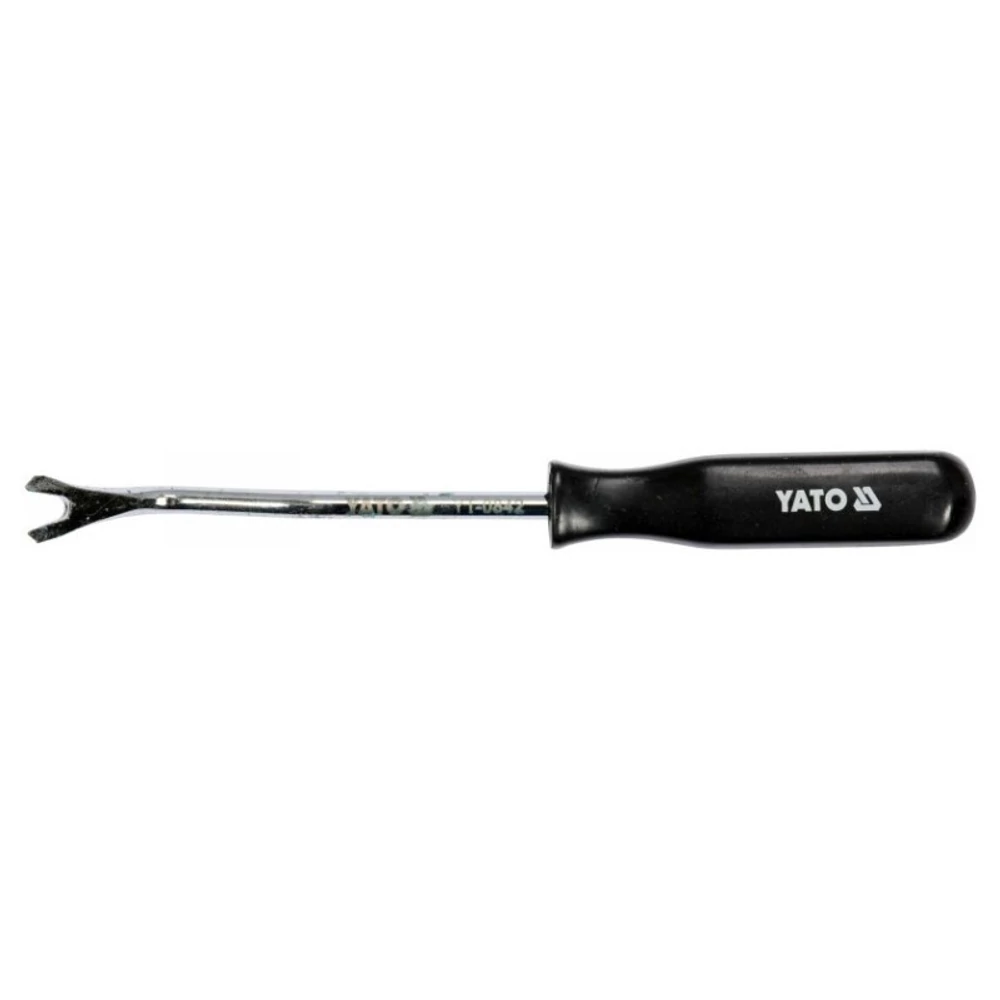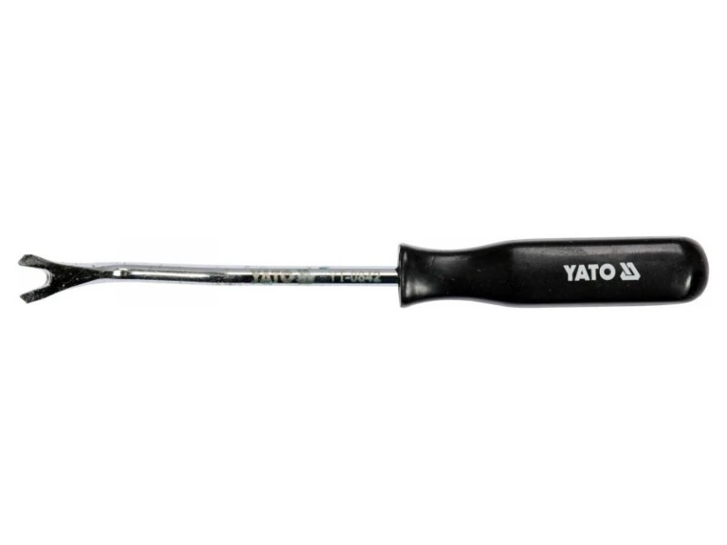YATO Kárpitkiszedő 200 mm Villásfogó, úgynevezett villa, a dübel & oacute; kihúzására a bútorborítás rögzítésében. A kar segítségével könnyedén szétszerelhetők a bútorborítás összecsapásai, károsodásuk kockázata nélkül & nbsp Mandzsetta alakú 8 mm. A húzóeszközt a belső elemek és a karosszéria összeillesztéséhez használt bútorborítás kapcsok biztonságos kikapcsolására használják. A húzóeszköz egy mandzsettával vagy dübellel ellátott dübelt szabadít fel a lyukból, a munkahegy villa szerkezetét és a karos emelőt használva. Használati figyelmeztetések: A kéziszerszámok használata veszélyes lehet! Mindig használjon személyes védelmi felszerelést munka közben. Csak megfelelő, sérülésmentes szerszámokat használjon. Válassza ki a szerszám típusát és méretét a tervezett alkalmazás szerint. Ne terhelje túl a szerszámokat. Tartsa a szerszámokat távol a gyermekektől. Gondosan használja a szerszámokat.