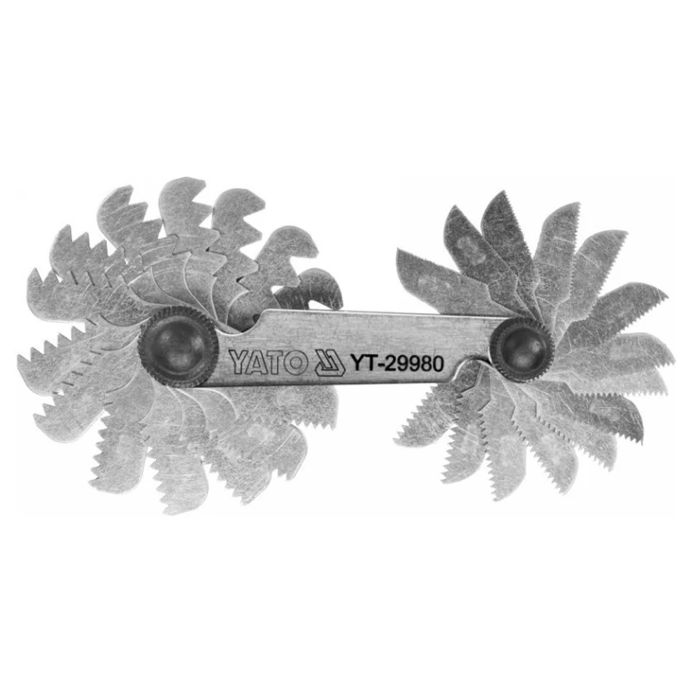 YATO Menetfésű 24 lapos metrikus 0,25-6,0 mm 60° A mérőeszköz edzett acéllemezből készült. 24 döntött lemeze van 24 döntött lemez van bevágott menetrács mintával belső és külső metrikus 60° menetekhez tervezve, 0,25-6,0 mm közötti menetemelkedéssel a betétek a házban csavarzárral vannak rögzítve belső vagy külső metrikus menetek ellenőrzésére szolgál válassza ki az a sablonbetétet, amely a legjobban illeszkedik a tesztelendő menet fogaihoz a menet paraméterei a betéten találhatók