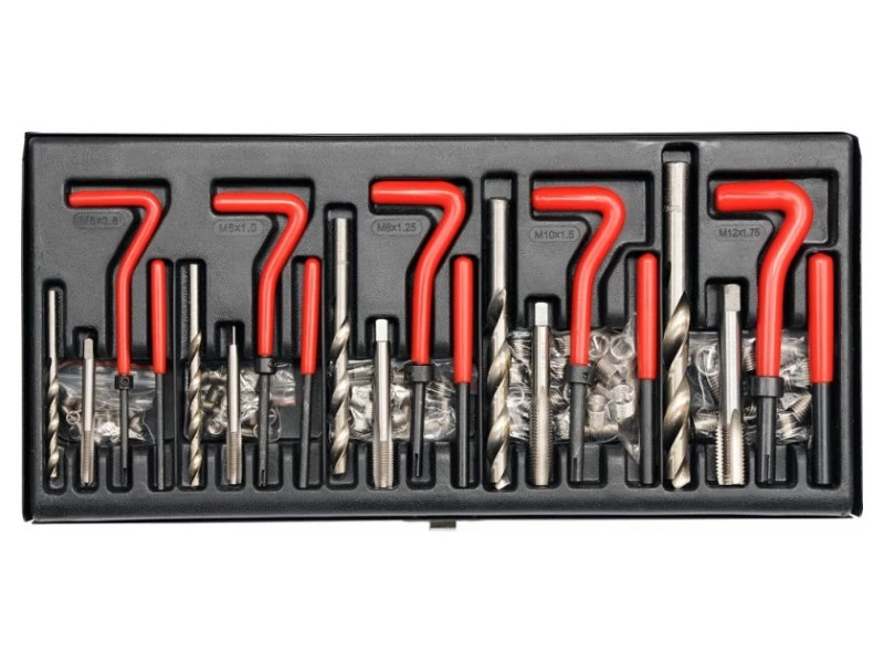 YATO Menetjavító készlet 131 részes M5-M12 Professzionális M5-M12 menetjavító készlet.A fúrók és csapok HSS 4341 gyorsacélból készültek. A szimpla fázisú csapok menetet vágnak, amibe egy kemény rozsdamentes acél spirális betét kerül. A betétek behelyezéséhez egy irányító gombot használnak, valamint egy szerszámot, ami leszakítja a betét kiálló végét.A készlet 5 féle menet kialakítására alkalmas:M5 x 0.8 x 6.7 mmM6 x 1.0 x 10.8 mmM8 x 1.25 x 10.8 mmM10 x 1.5 x 13.5 mmM12 x 1.75 x 16.3 mm. Professzionális M5-M12 menetjavító készlet. A fúrók és csapok HSS 4341 gyorsacélból készültek. A szimpla fázisú csapok menetet vágnak, amibe egy kemény rozsdamentes acél spirális betét kerül. A betétek behelyezéséhez egy irányító gombot használnak, valamint egy szerszámot, ami leszakítja a betét kiálló végét. A készlet 5 féle menet kialakítására alkalmas: M5 x 0.8 x 6.7 mm, M6 x 1.0 x 10.8 mm, M8 x 1.25 x 10.8 mm, M10 x 1.5 x 13.5 mm, M12 x 1.75 x 16.3 mm. - Határozza meg a sérült menet méretét, majd válassza ki az azonos méretű javítókészletet- Tágítsa ki a sérült menetet a készletben található fúróval- Menetelje meg a furatot a készletbe tartozó menetvágóval. A menetvágót a menetfúró gépekhez tervezett gombba kell helyezni. A gomb nem tartozik a készlet felszereléséhez- A spirál betétek gombján helyezze el a betétet úgy, hogy a betét átlós része a gomb nyílásában legyen. Majd rögzítse a betétet egy gyűrűvel, hogy az ne nyúljon meg a becsavarás során. Rögzítse a gyűrűt egy csavarral- Csavarja be teljesen a betétet az előre menetelt lyukba. Húzza ki a gombot. Törjön le a betét átlós részét egy szeg segítségével- Csavarja be a csavart a megjavított menetbe. - Fúrók a sérült menet kitágításához: 5db- Egyszakaszos menetvágók az új betét menetének kialakításához: 5db- spirál betétek: 5 csomag - gombok a spirál betétek becsavarásához: 5db- szerszámok: 5db- imbuszkulcs: 1db- doboz