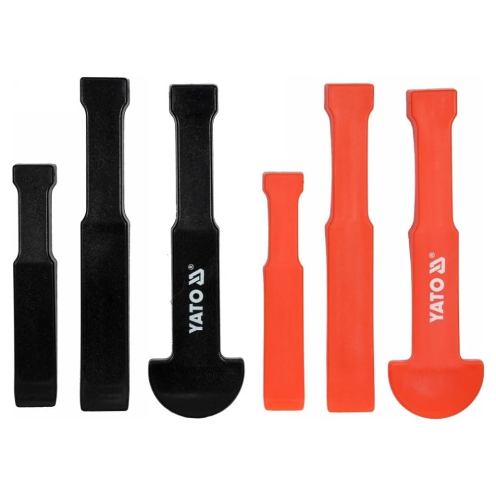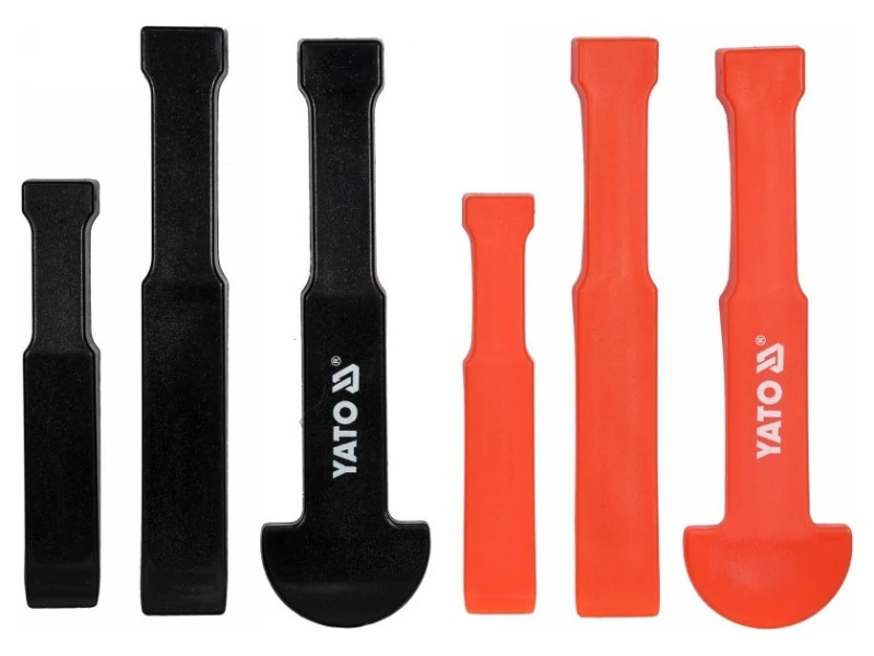 YATO Műanyag véső készlet 6 részes Egy műanyag vágókészlet, amely panelek, ragasztott elemek stb. szétszerelésére készült. Lehetővé teszik az elemek szétválasztását a károsodás lehetőségének minimálisra csökkentésével. Lapos és kerek pengék profiljai, méretek: 127 x 22,2 x 12,7 mm, 175 x 12,7 x 41,25 mm, 175 x 50 x 41,25 mm. A vágók könnyű kalapáláshoz vannak igazítva. Panelek, ragasztott elemek, autó- és bútor-kárpitok stb. szétszerelésére tervezték. Használati figyelmeztetések: Figyelem! Mindig használjon személyes védőfelszerelést a munka során.