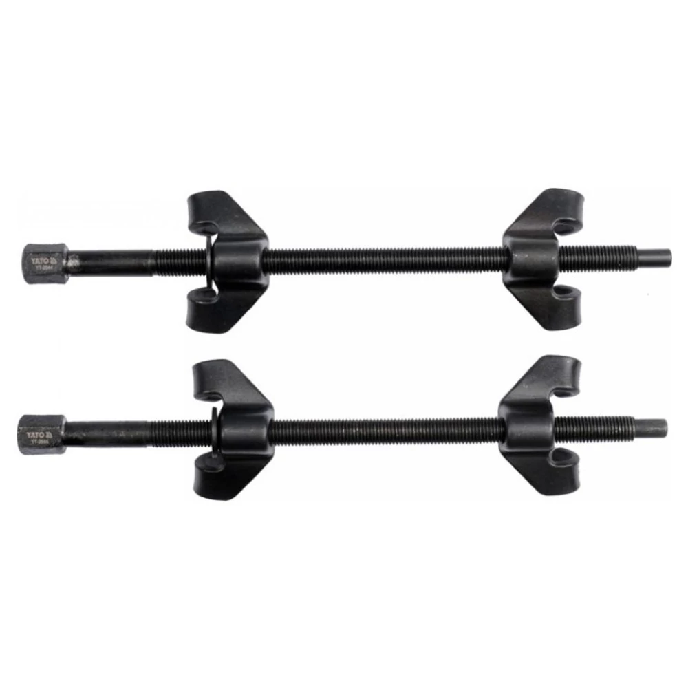 YATO Rugóösszehúzó 82 x 370 (2 db) Professzionális rugóhúzók 370 mm hosszúságban, amelyeket a MacPherson oszlopokban és másokban lévő rugók biztonságos és kényelmes szerelésére és eltávolítására terveztek. Elengedhetetlen minden autószerelő műhelyben. A munka biztonságos, köszönhetően a különlegesen kontúrozott, két karos fogantyúknak.alkalmazható minden típusú rugóhoz a McPherson oszlopokban és független rugókhozfinom menettel rendelkeznek a rugó terhelése alatti munka megkönnyítése érdekében1/2" racsnival működnek A húzókészlet két csavarból és négy két karos fogantyúból áll.