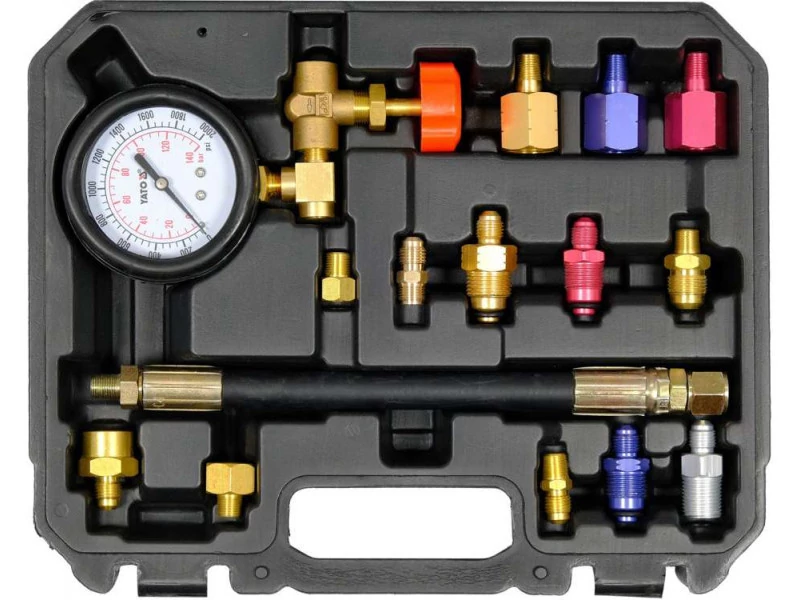 YATO Szervókormány nyomásmérő készlet 15 részes A készletet a hidraulikus szervórendszer diagnosztizálására tervezték. A nagynyomású csatlakozásra csatlakoztatva a készülék lehetővé teszi a jármű kormányrendszerének összeszerelési hatékonyságának meghatározását. a gépkocsi vizsgálata az alkatrészek szétszerelése nélkül történik a szettben 13 adapter található, amely a legtöbb európai és ázsiai autóhoz alkalmas a szett a legtöbb európai és ázsiai autóhoz alkalmas. magas minőségű európai gyártók alkatrészei menetes csatlakozók