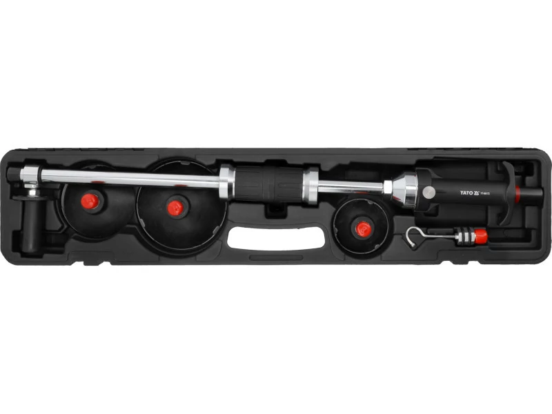 YATO Vákuumos horpadás javító készlet Porszívókorongos horpadáseltávolító, mely a festék sérülése nélkül távolítja el a karosszéria horpadásait. Szilárd fogást biztosít a panelen a horpadások és bemélyedések inerciakalapáccsal való eltávolításakor. Ideális az elsődleges panel átalakításához. Beépített vákuumjelzővel felszerelt. A csomagban található porszívókorongok: O75, O100 és O125 mm és egy horog Hossza: 730 mm nem károsítja a festék felületét Használati figyelmeztetések: Figyelem! Mindig használjon személyes védőfelszerelést a munka során.