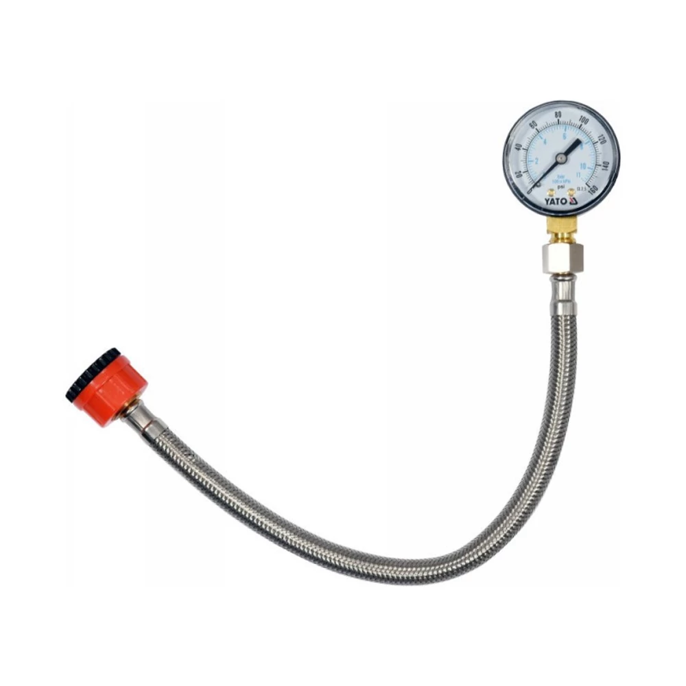 YATO Víznyomásmérő 1/2"-3/4" 0-1,1 Mpa Víznyomásmérő tömlővel, amelyet a víznyomás rendszerben történő mérésére használnak. Megkönnyíti a vízvezeték-hibák diagnosztizálását. víznyomásmérő, 11 bar tartományban (1.1 MPa) rozsdamentes acélból fonott tömlő, 30 cm hosszúságban csatlakozó méretek: 3/4", 1/2"